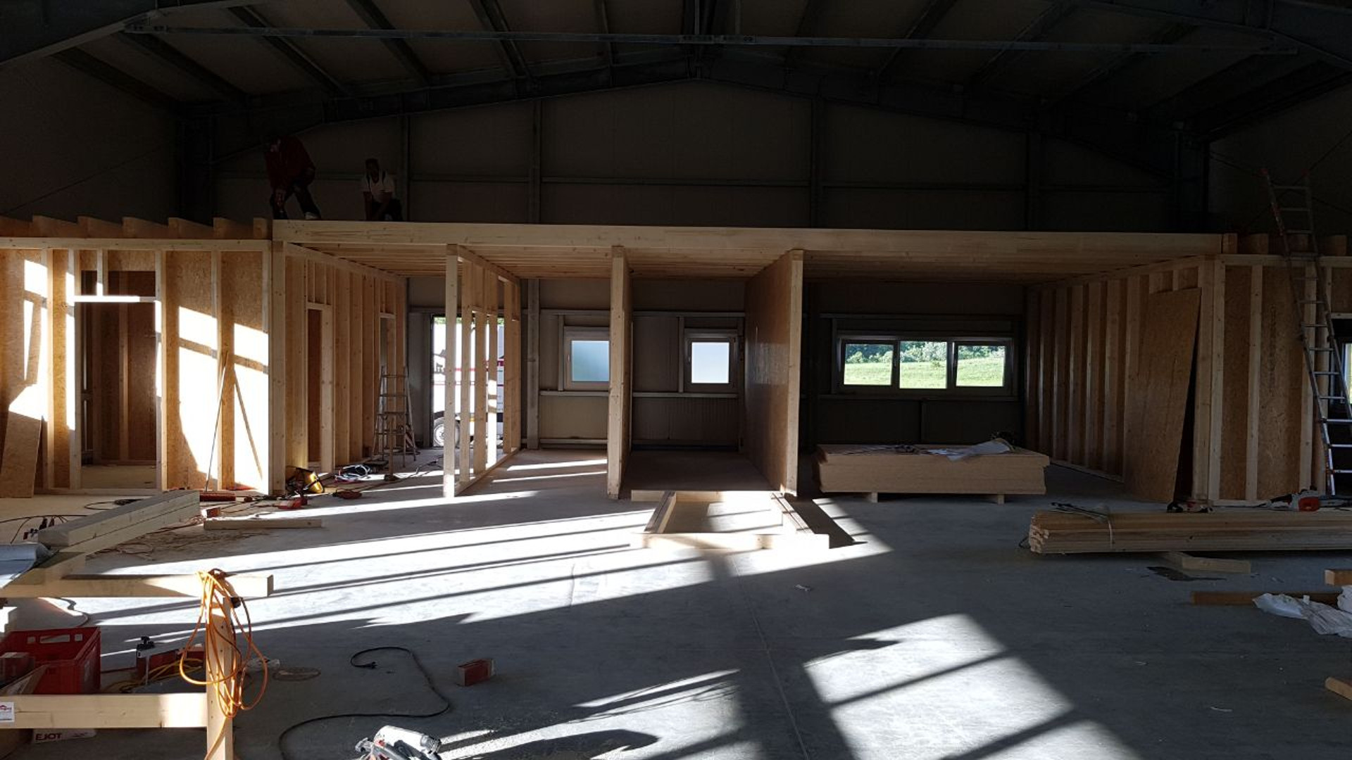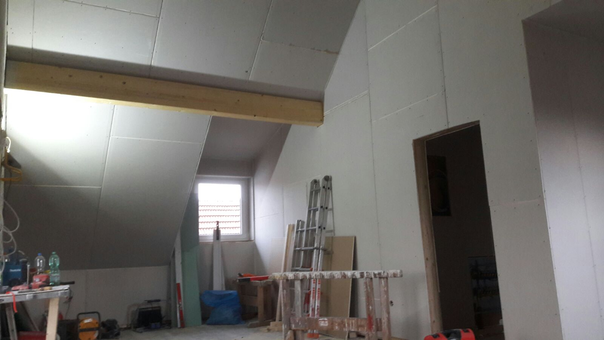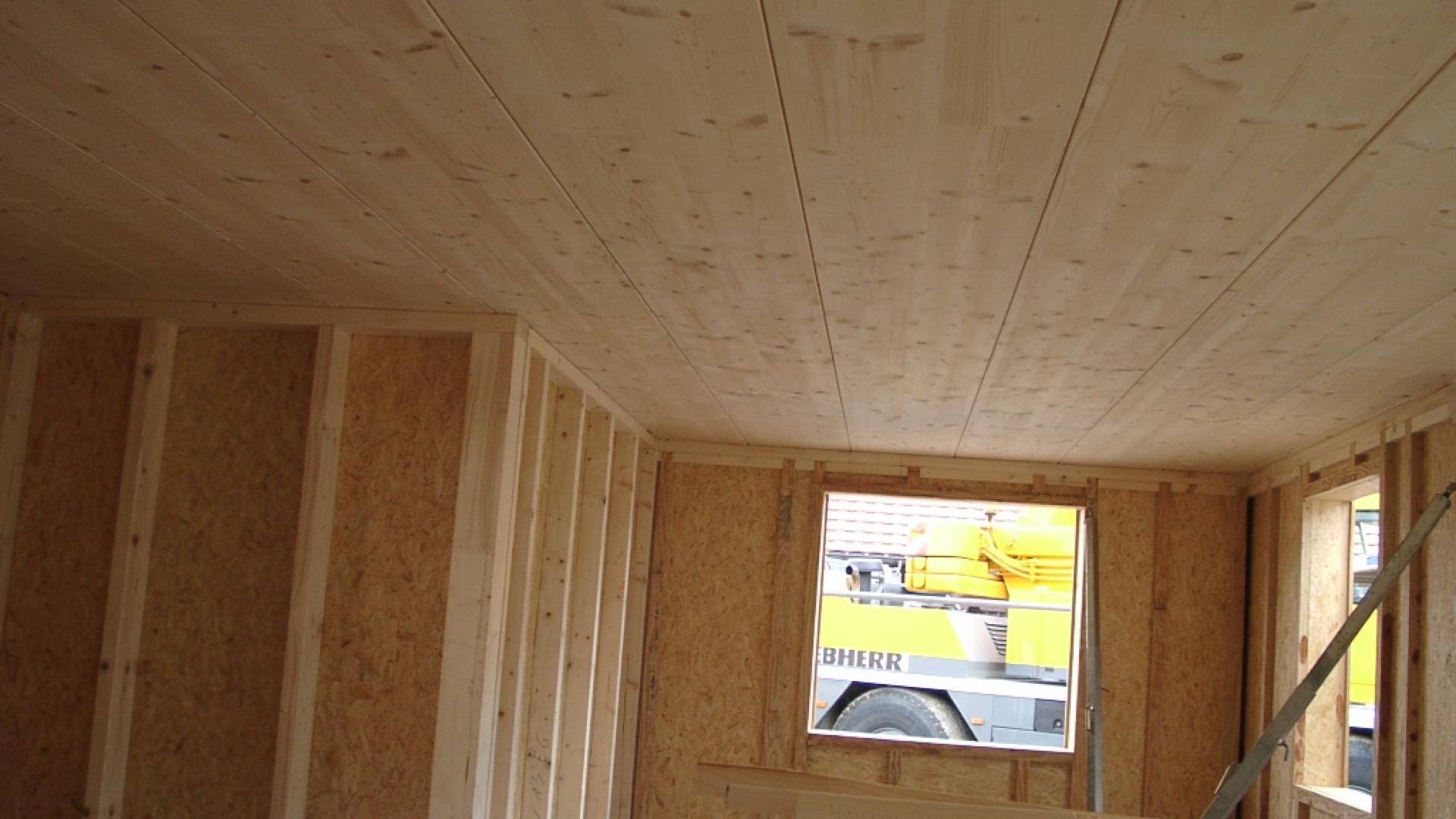 Holz im Hintergrund. Im Trockenbau erweist sich Holz als ideales Baumaterial für ein Holzständerwerk als Wandaufbau oder für die Boden- bzw. Deckenkonstruktion. An dieser Holzunterkonstruktion werden dann Trockenbauplatten in Form von Gipskarton oder Gipsfaserplatten befestigt. Bei Bedarf auch mit Dämmstoffen im Ständerwerk.